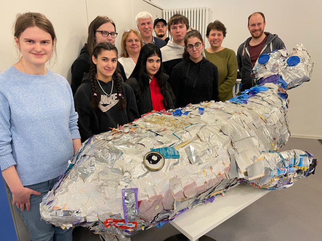 Wal „WALter“ besteht komplett aus Kunststoffabfällen, die die SchülerInnen eingesammelt haben. Mit dem Meeressäuger haben sie im Unterricht das Thema der Verschmutzung der Weltmeere aufgearbeitet und in diesem Kunstwerk verbildlicht. Seit Mittwoch ist der Wal in der Volksbank-Filiale am Schlossplatz ausgestellt.